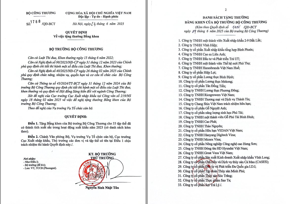Danh sách các doanh nghiệp có thành tích xuất sắc trong hoạt động xuất khẩu vinh dự nhận Bằng khen của Bộ trưởng Bộ Công thương