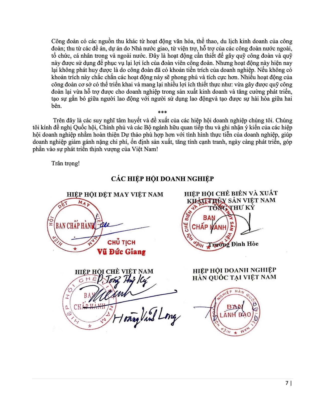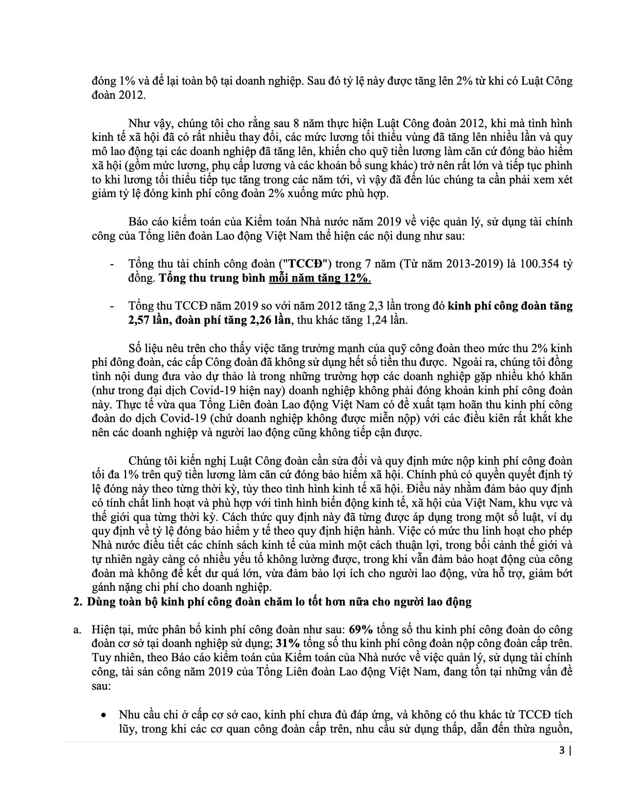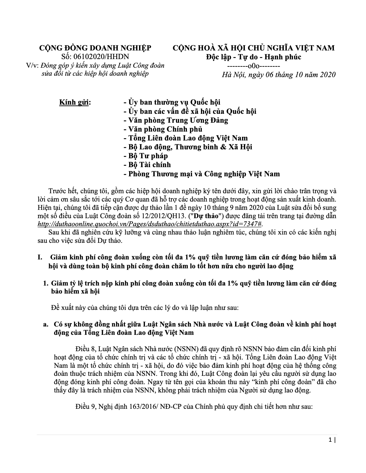 Trong công văn 06102020/HHDN, các Hiệp hội kiến nghị giảm kinh phí công đoàn xuống còn tối đa 1% quỹ tiền lương làm căn cứ đóng bảo hiểm xã hội và dùng toàn bộ kinh phí công đoàn chăm lo tốt hơn nữa cho người lao động. Vì không đồng nhất giữa Luật Ngân sách Nhà nước và Luật Công đoàn về kinh phí hoạt động của Tổng Liên đoàn Lao động Việt Nam.