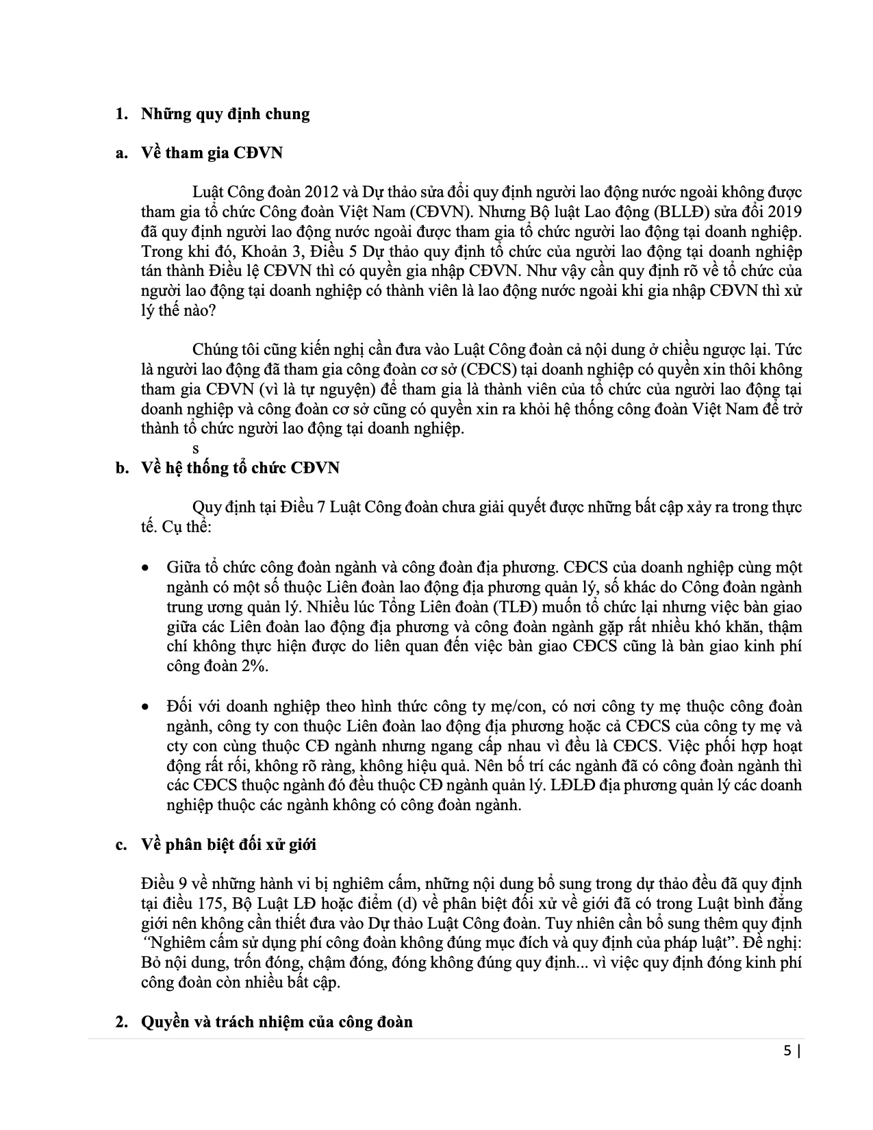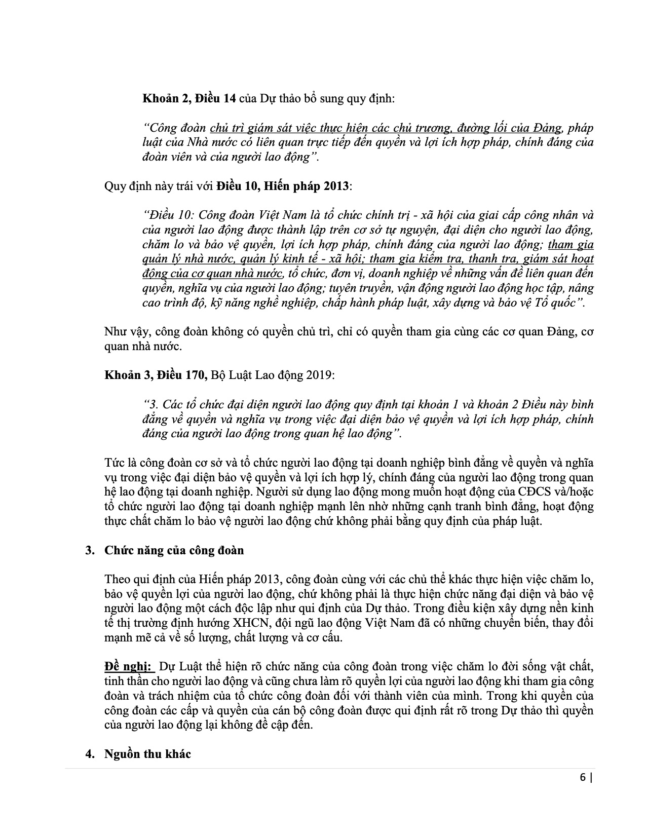 - Quyền và trách nhiệm của công đoàn, Khoản 2, Điều 14 của Dự thảo bổ sung quy định trái với Điều 10, Hiến pháp 2013 và Khoản 3, Điều 170, Bộ Luật Lao động 2019.
