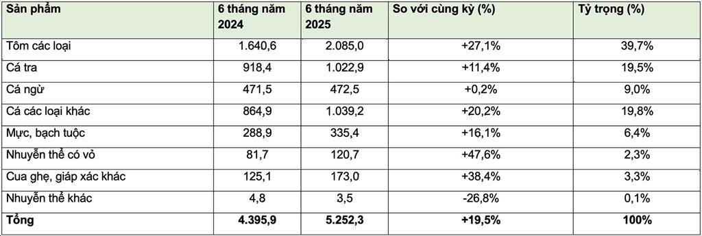 Trong 6 tháng đầu năm 2025, ngành thủy sản ghi nhận kim ngạch xuất khẩu đạt 5,25 tỷ USD, tăng 19,5% so với cùng kỳ năm 2024. Kết quả này cũng phản ánh sự cải thiện nhu cầu tiêu thụ toàn cầu và năng lực thích ứng linh hoạt của doanh nghiệp trong bối cảnh biến động thị trường.