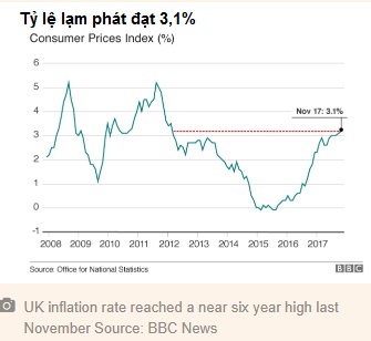 Theo BBC, tỷ lệ lạm phát ở Anh giảm xuống còn 3% vào tháng 12/2017, giảm so với mức 3,1% trong tháng 11/2017 - mức cao nhất trong 6 năm qua.