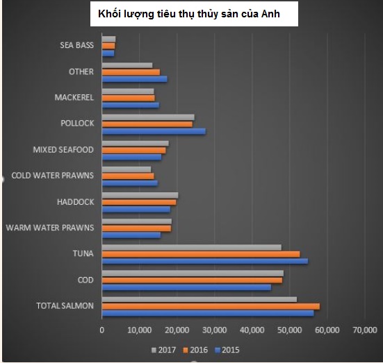 Tổng sản lượng thủy sản của Anh trong năm 2017 giảm 3,6% về khối lượng xuống còn 318.110 tấn, giảm 11.718 tấn so với năm trước.
