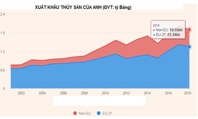 (vasep.com.vn) Theo dữ liệu của Uỷ ban thương mại quốc tế (ITC), giá trị xuất khẩu thủy sản của Vương quốc Anh sang thị trường EU đạt 1,34 tỷ bảng Anh, chiếm hơn 70% giá trị xuất khẩu thủy sản của nước này.