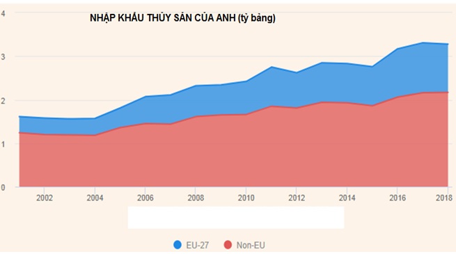 Xét trên phương diện nhập khẩu, nhập khẩu thủy sản của Vương quốc Anh chủ yếu là cá tuyết, tôm và cá hồi từ các nước ngoài EU. Năm 2018, giá trị nhập khẩu từ các quốc gia ngoài EU tăng nhẹ, từ 2,16 tỷ lên 2,17 tỷ bảng.