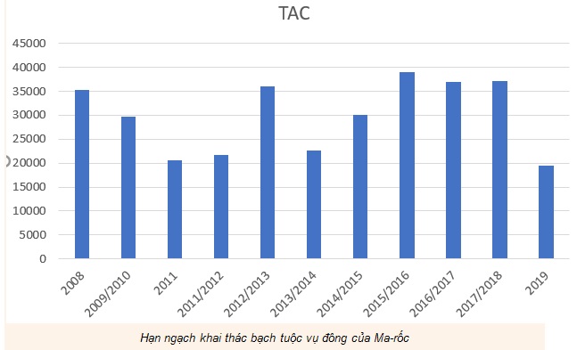 Hạn ngạch cho vụ khai thác năm nay (bắt đầu vào ngày 5/1) hiện đang ở mức 19.500 tấn, là mức thấp nhất trong 10 năm qua. Chính phủ Maroc đặt TAC thấp như vậy để ngăn hiện tượng rớt giá; và TAC có thể tăng thêm vào cuối tháng 3 nếu mức cũ đã được khai thác hết. Tuy nhiên, việc có tăng TAC hay không còn phụ thuộc vào tình hình phát triển của hoạt động đánh bắt.