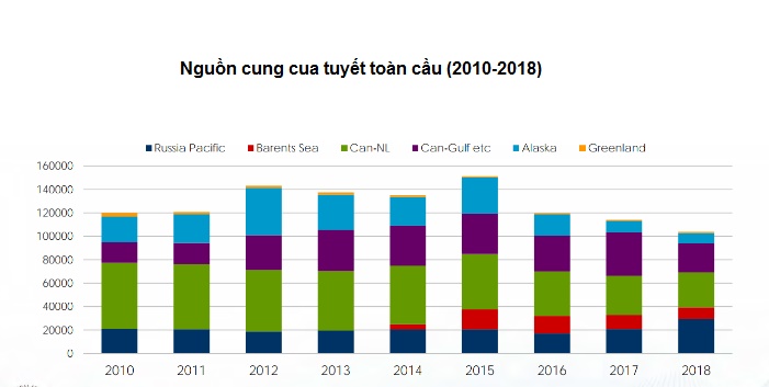 Theo số liệu mới đây, dự kiến sản lượng cua tuyết đạt khoảng 104.000 tấn, giảm 10% so với con số 114.000 tấn cập bến trên toàn thế giới vào năm 2017 và 76% dưới mức 150.000 tấn cập bến vào năm 2015.