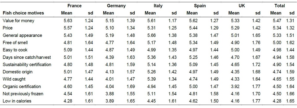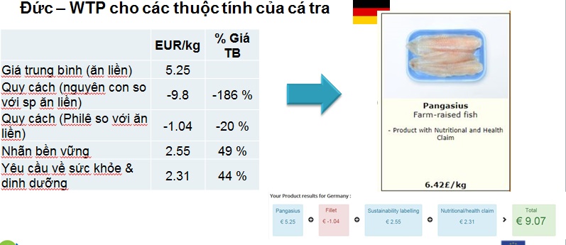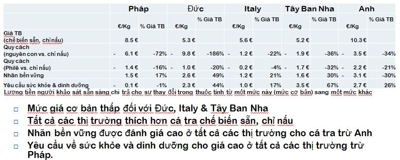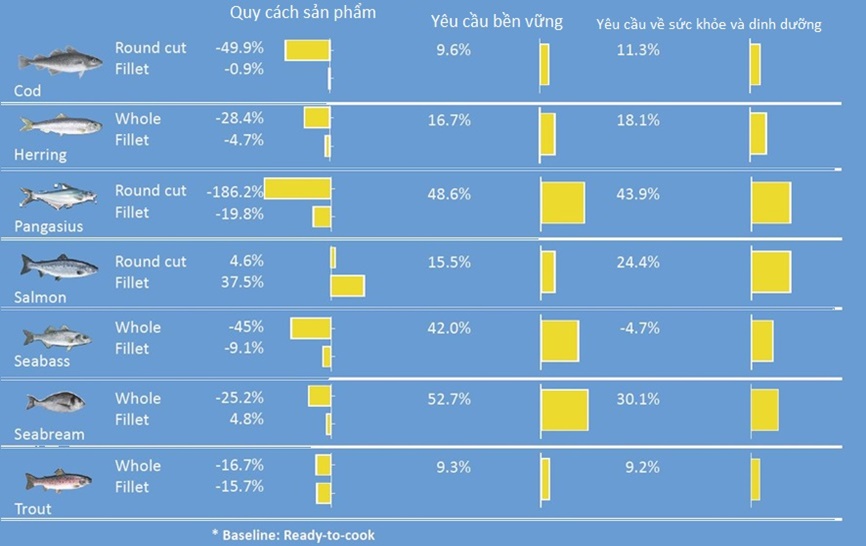 -Mức sẵn lòng chi trả đối với cá tăng khi đó là cá khai thác tự nhiên, chế biến sẵn, chỉ nấu (trừ cá hồi) ), với nhãn bền vững và yêu cầu về sức khỏe và dinh dưỡng (đối với 1 số loài)
