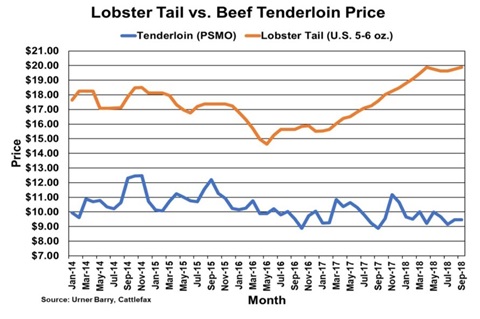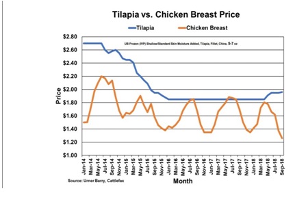 Trong khi đó, giá thủy sản đang trở nên đắt hơn, ví dụ, giá trung bình tôm hùm bỏ đầu cỡ 5- 6 oz là 20 USD vào tháng 9/2018 so với 19,50 USD giá một miếng thịt thăn bít tết cùng trọng lượng, trong khi giá trung bình cá rô phi phile cỡ 5-7 oz từ Trung Quốc là 2 USD so với giá thịt gia cầm trọng lượng tương đương là 1,20 USD.