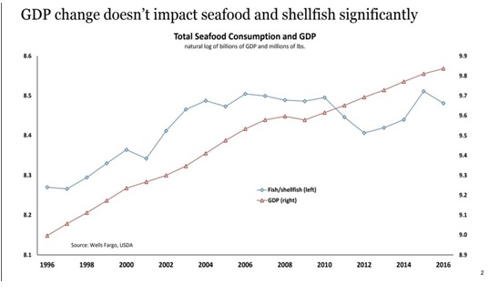 Trong khi GDP của Mỹ đang tăng từ hơn 2,5% vào năm 1996 lên gần 2,9%, thì tiêu thụ thủy sản của Hoa Kỳ hầu như không vượt lên khỏi mức 9,4 pao/người.
