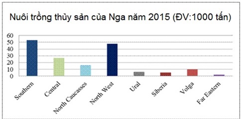 Ba vùng nuôi trồng thủy sản chủ lực của Nga năm 2015 là Vùng Nam Liên bang với tổng sản lượng 53.200 tấn, đặc khu phía Tây Bắc Ural đạt 47.800 tấn và vùng trung tâm Liên bang với 27.000 tấn. Nuôi trồng thủy sản ở các đặc khu liên bang Ural (sản lượng 6.100 tấn) và Siberia ( sản lượng 5.500 tấn) được Cơ quan Thủy sản Liên bang (FFA) nhận định là khớc này.