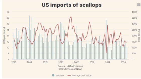 Sò điệp nhập khẩu của Mỹ giảm 33% trong tháng 4/2020