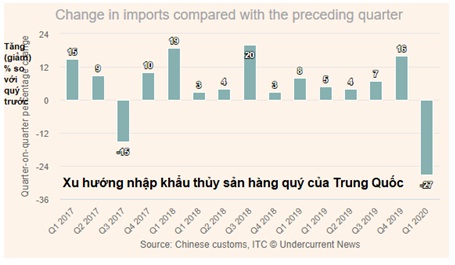 Sự bùng phát của dịch COVID-19 xảy ra sau thời điểm cuối năm 2019 gần Tết Nguyên đán khi Trung Quốc tăng NK. Trong Q4/2019, Trung Quốc đã NK thủy sản với giá trị kỷ lục ở mức 4,51 tỷ USD, tăng 13% so với Q3/2019. Trước khi giảm NK thủy sản trong Q1/2020, NK thủy sản của Trung Quốc đã tăng trong 11 quý liên tiếp.