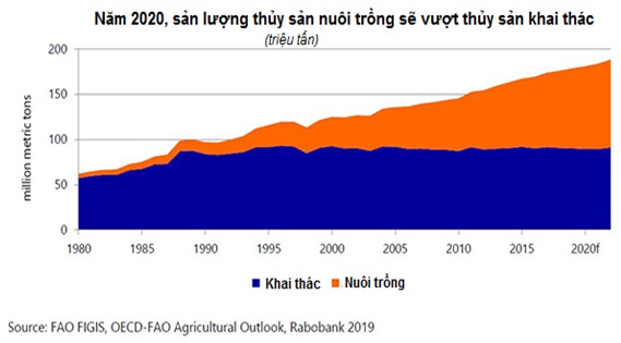 Sản lượng khai thác thủy sản đi ngang trong khi sản lượng thủy sản nuôi trồng tiếp tục tăng lên. Rabobank dự báo tăng trưởng sản lượng thủy sản trong tương lai tiếp tục dựa vào hoạt động nuôi trồng, vốn chủ yếu nhờ vào chất lượng con giống tăng lên, các công nghệ nuôi ấp mới, các sáng kiến về thức ăn thủy sản và chuyển dịch sang các công nghệ nuôi hiệu quả hơn, thâm canh hơn.