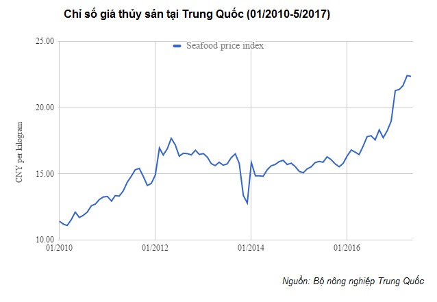 Theo MoA, trong tháng 5/2017, giá trung bình đối với thủy sản của Trung Quốc là 22,25 NDT/kg (3,27 USD / kg), tăng 31% so với cùng kỳ năm ngoái. Giá thủy sản tăng mạnh trong giai đoạn chuẩn bị năm mới của Trung Quốc, thời gian thương mại thủy sản nhộn nhịp nhất năm và tiếp tục tăng trong những tháng sau đó.