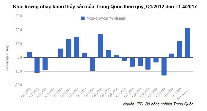 Theo MoA, trong 4 tháng đầu năm 2017, NK thủy sản của Trung Quốc đạt 1,53 triệu tấn, tăng 22% so với năm ngoái. Giá trị NK trong giai đoạn này là 3,28 tỷ USD, tăng 17% so với cùng kỳ năm ngoái.