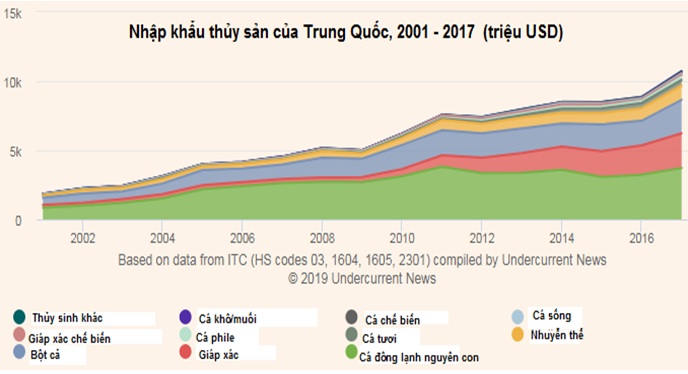 Trong những năm gần đây, bức tranh chân thực về sự bùng nổ tiêu thụ thủy hải sản của Trung Quốc đã bị che giấu do buôn bán thủy sản bất hợp pháp qua biên giới giữa miền bắc Việt Nam và miền nam Trung Quốc. Thương mại mậu biên rộ lên để tránh thuế nhập khẩu của Trung Quốc (vì nước này đánh thuế nhập khẩu cho tiêu dùng nội địa nhưng không đánh thuế nguyên liệu thô để chế biến và tái xuất ) và để tránh bị kiểm tra, vì vậy nhập khẩu hợp pháp đã bị cắt giảm và một lượng lớn nhập khẩu thủy sản đã bị che giấu.