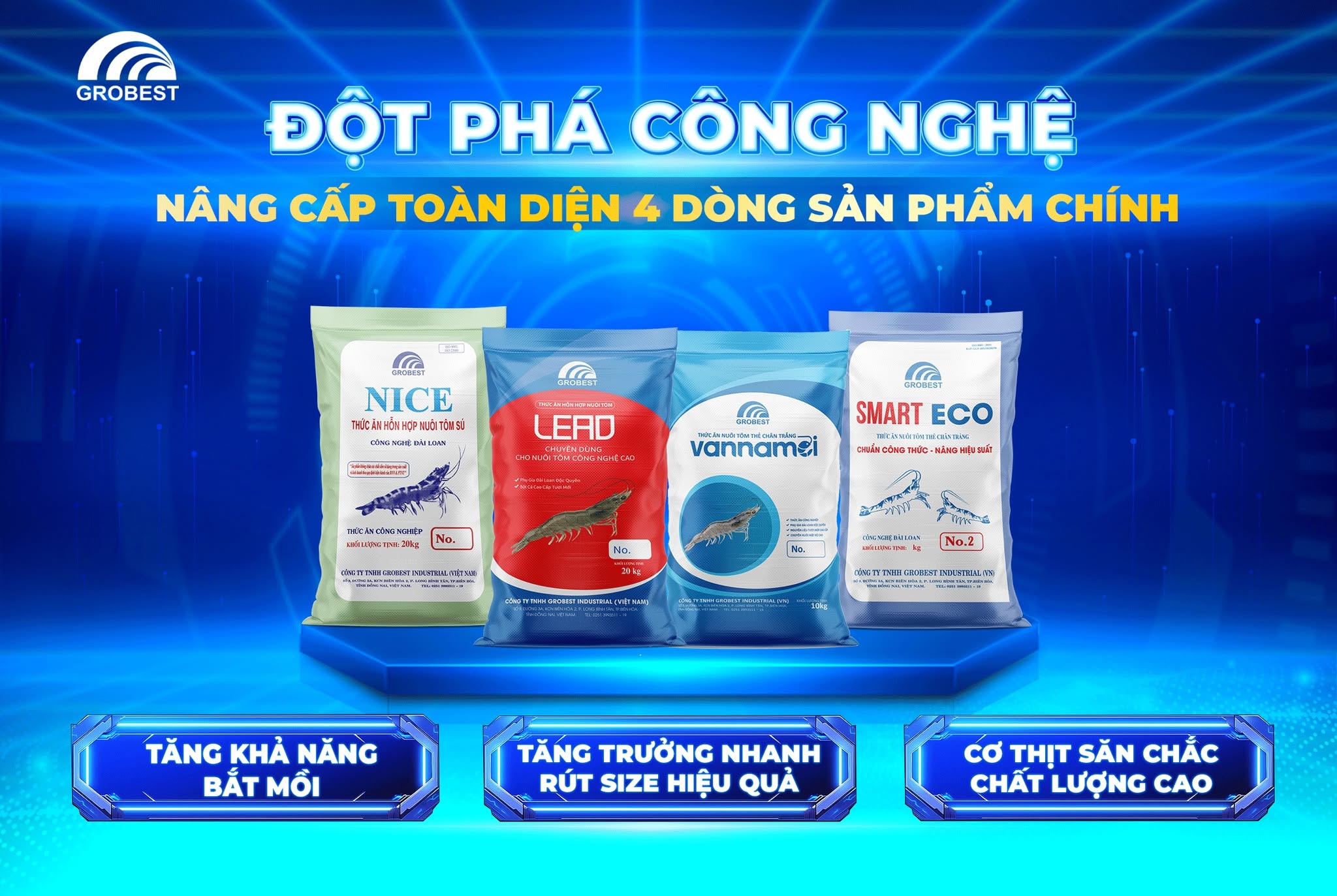 Hơn 25 năm qua, Grobest luôn tiên phong mang đến các giải pháp dinh dưỡng cải tiến, giúp người nuôi vượt thách thức thị trường. Năm 2025, Grobest Việt Nam chủ động nâng cấp toàn bộ sản phẩm. Các dòng chủ lực như LEAD, NICE, VANNAMEI và ECO được cải tiến sớm đã ghi nhận hiệu quả vượt trội qua vụ nuôi thực tế.