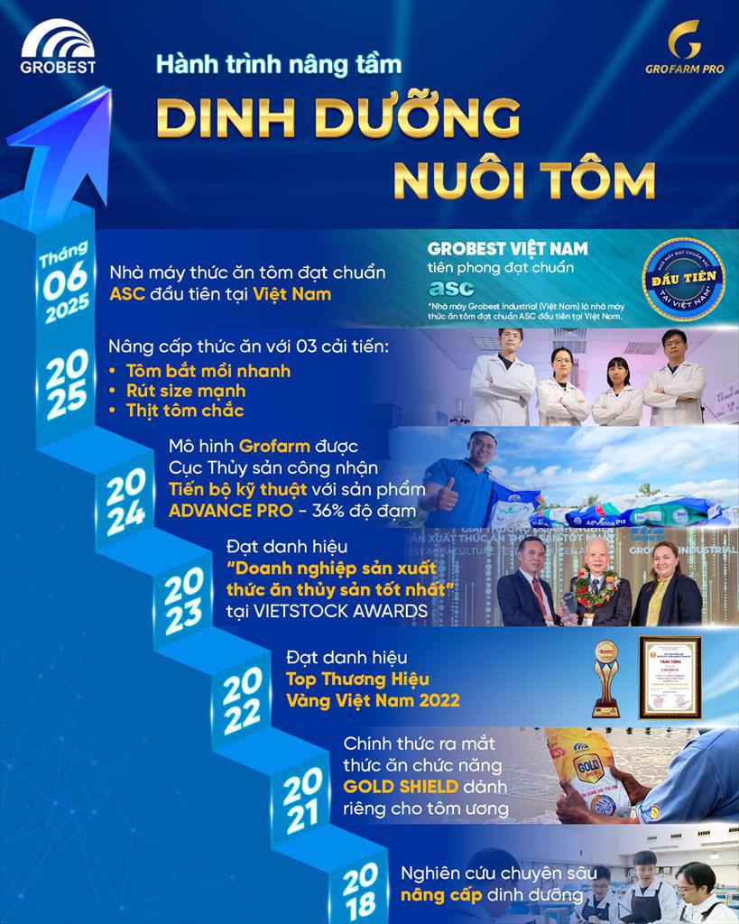 Ngày 25/6/2025, Grobest chính thức được công nhận là nhà máy thức ăn tôm đầu tiên tại Việt Nam đạt chứng nhận ASC, tiêu chuẩn cho thức ăn thủy sản đáp ứng yêu cầu về môi trường, xã hội và truy xuất nguồn gốc. Thành tựu này khẳng định vai trò tiên phong của Grobest và thúc đẩy ngành tôm Việt phát triển bền vững.