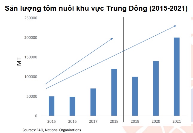 Dự kiến sản lượng tôm nuôi ở Trung Đông sẽ tăng lên 500.000 tấn trước năm 2030 nhờ các dự án phát triển mới ở Ả Rập Xêút, Ai Cập và Iran cũng như xây dựng các khu sản xuất mới ở Oman và Qatar.