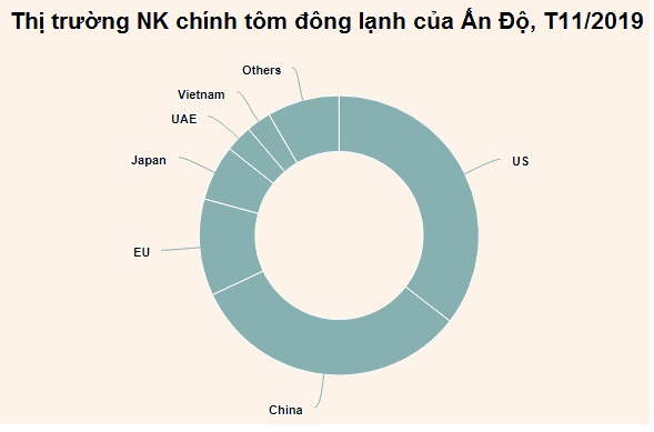 XK tôm Ấn Độ sang Trung Quốc trong tháng 11/2019 tăng 37% so với tháng 10/2019 đạt 22.000 tấn trong khi XK sang Mỹ (thị trường NK lớn nhất tôm Ấn Độ) đạt 24.000 tấn, giảm 12% so với tháng 10/2019.