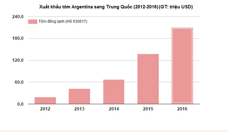 Năm 2012, Trung Quốc NK chỉ 19,5 triệu USD tôm Argentina. Trong 5 năm (2012-2016), XK sang Trung Quốc tăng 60,8%.