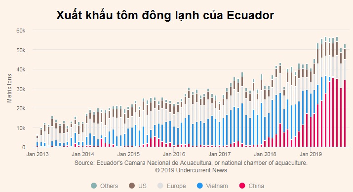 XK tôm đông lạnh Ecuador sang Trung Quốc phục hồi trong tháng 10/2019, đạt 34.000 tấn, tăng 13% so với tháng 9/2019. Giá trị XK đạt 199 triệu USD, tăng 17%. Giá XK tăng nhẹ 3% đạt 5,77 USD/kg.