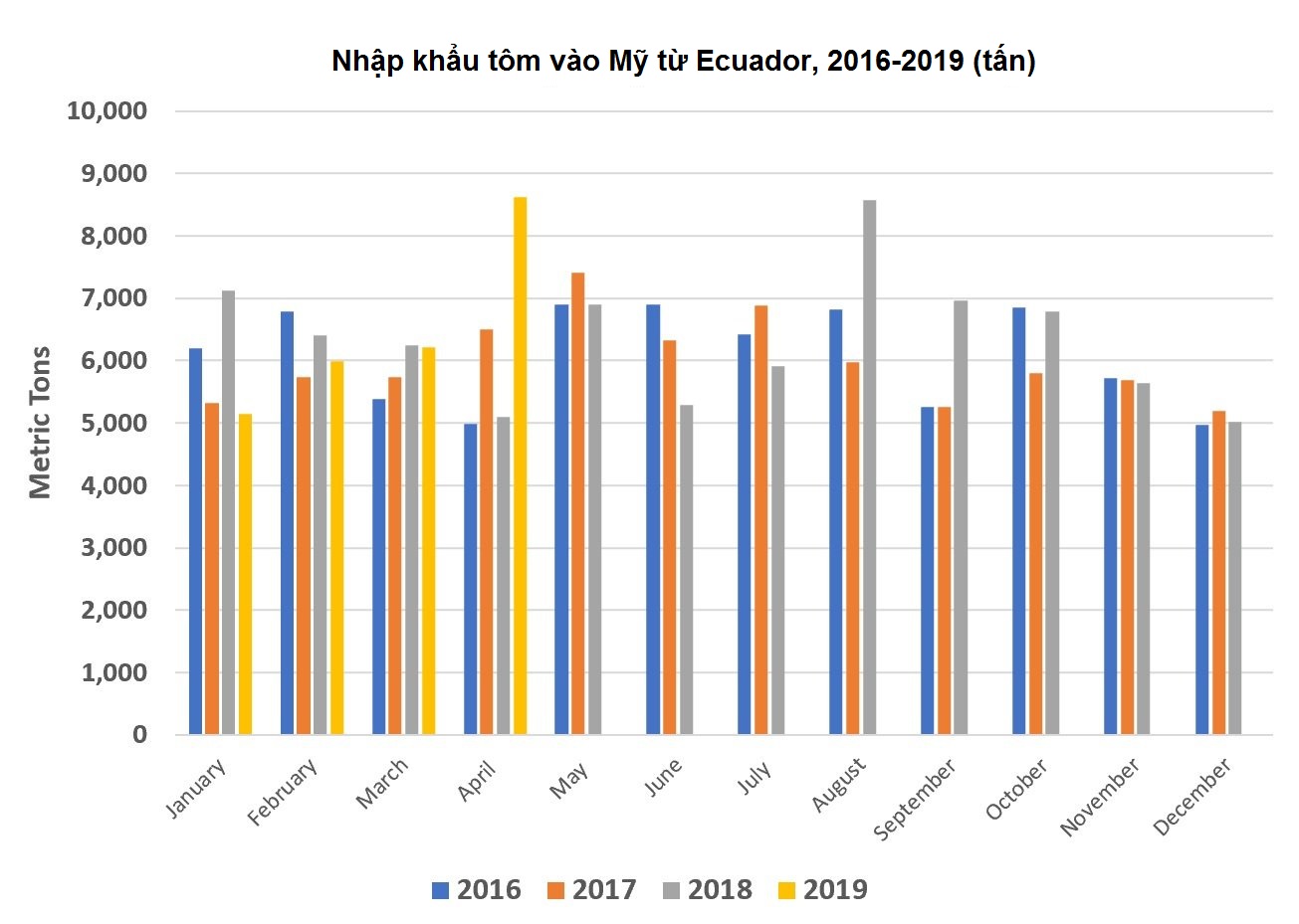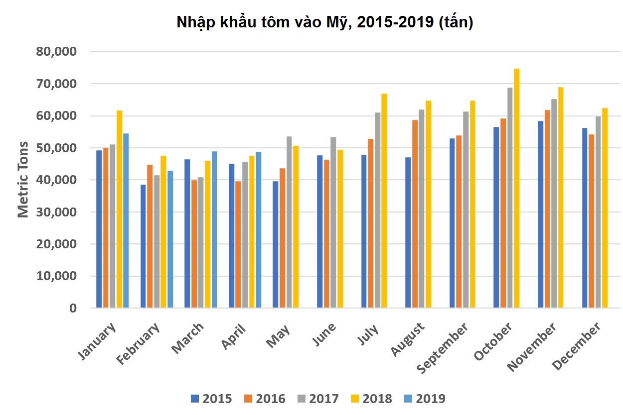 NK tôm từ Ecuador tăng cũng giúp tăng NK tôm chung của Mỹ. Mỹ NK 8.606 tấn tôm, trị giá 55,7 triệu USD từ Ecuador, tăng 69% về khối lượng và 49% về giá trị so với tháng 4/2018.
