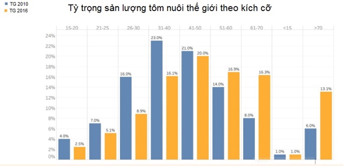 Năm nay, khoảng 2/3 sản lượng tôm nuôi thế giới dự kiến đạt kích cỡ 40 con/kg hoặc nhỏ hơn, theo khảo sát của Liên minh nuôi trồng thủy sản toàn cầu (GAA) được công bố tại GOAL. Trong khi chỉ một nửa tôm nuôi thế giới đạt kích cỡ này năm 2010.