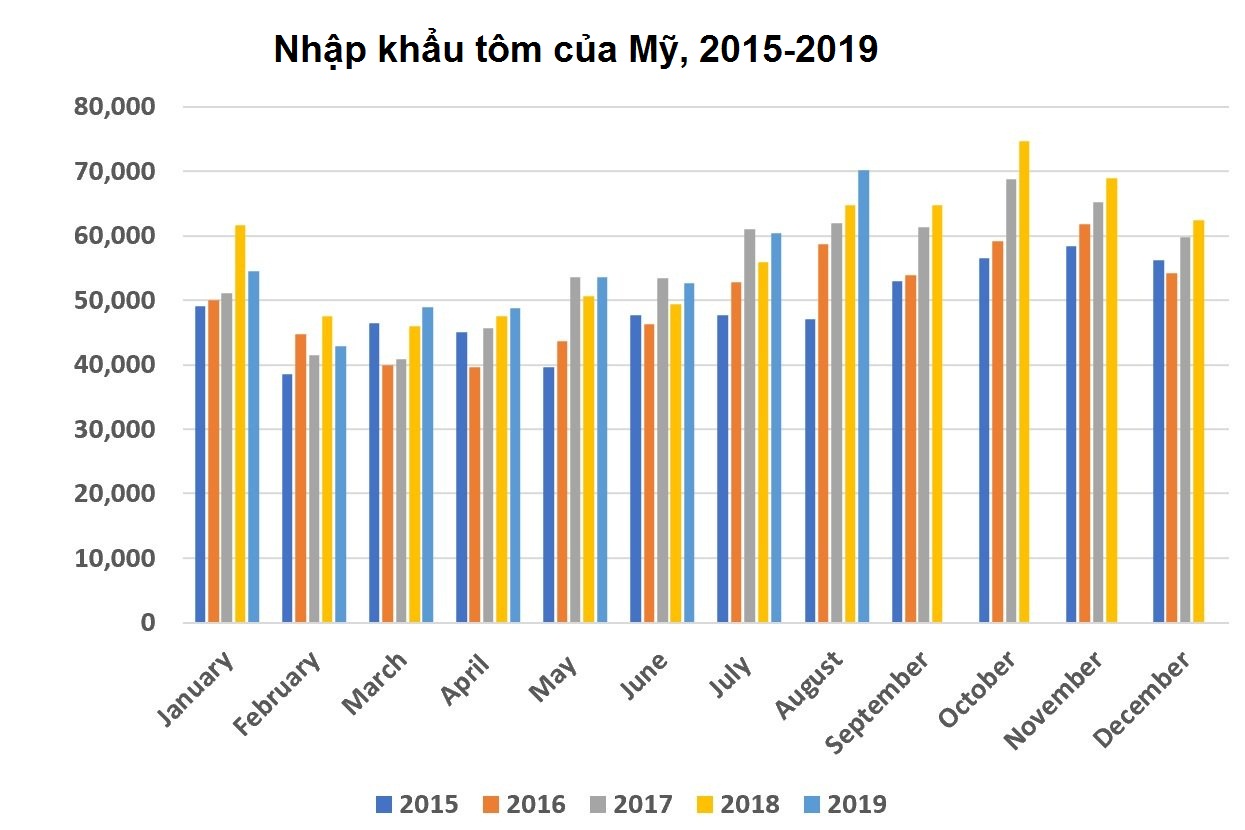 Mỹ NK chỉ 2.162 tấn tôm, trị giá 11 triệu USD (5,07 USD/kg) từ Trung Quốc trong tháng 8/2019 so với 5.699 tấn, trị giá 37,4 triệu USD (6,56 USD/kg) trong tháng 8/2018. Tám tháng đầu năm 2019, Mỹ NK 13.983 tấn tôm từ Trung Quốc, trị giá 75,6 triệu USD so với 29.930 tấn, trị giá 206,2 triệu USD của cùng kỳ năm 2018, giảm 53% về khối lượng và 63% về giá trị.