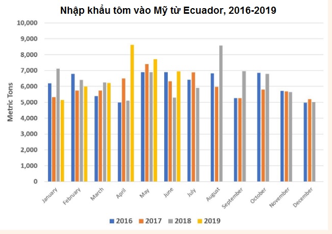 Nửa đầu năm 2019, Ecuador XK 40.609 tấn tôm sang Mỹ, trị giá 264,4 triệu USD, tăng 10% về khối lượng và giảm 0,15% về giá trị so với cùng kỳ năm 2018.