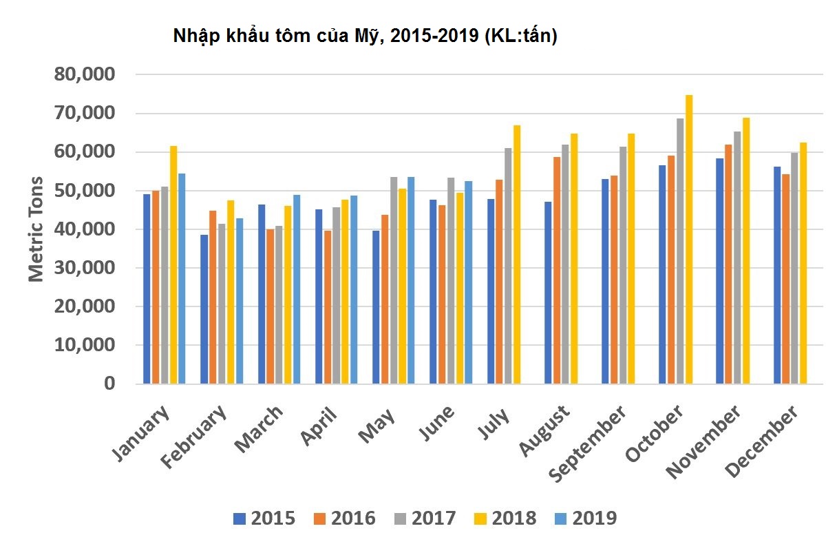 Mỹ NK 6.950 tấn tôm, trị giá 48,3 triệu USD từ Ecuador trong tháng 6/2019, tăng 31% về khối lượng và 41% về giá trị so với cùng kỳ năm ngoái. Giá trung bình NK đạt 6,93 USD/kg trong tháng 6/2019.