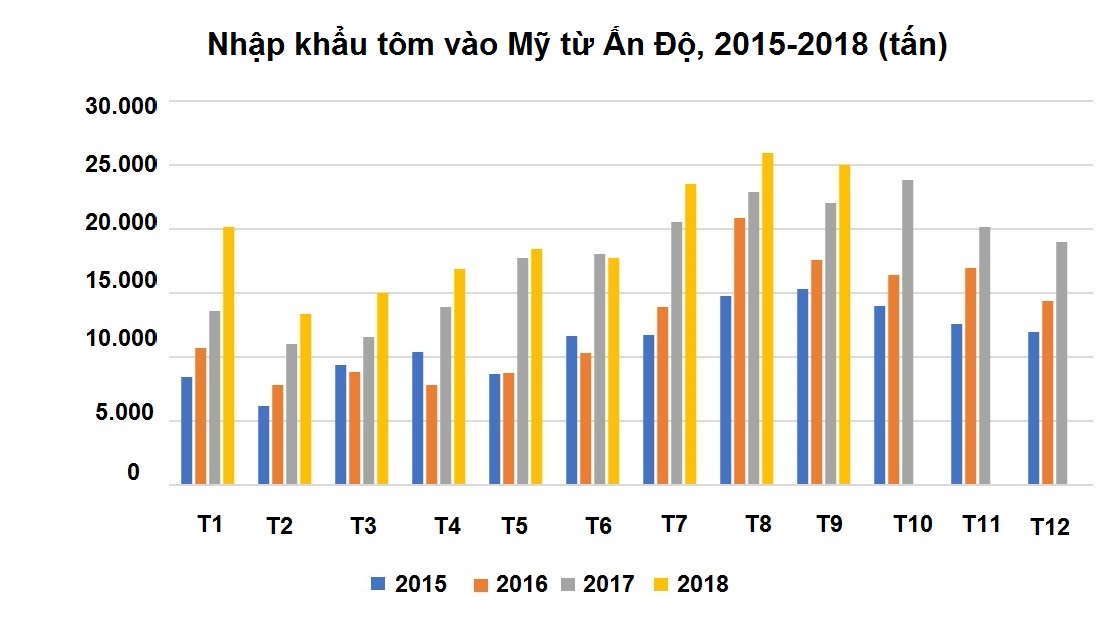 Ấn Độ, nguồn cung tôm lớn nhất chiếm 39% tổng NK tôm của Mỹ, XK 24.998 tấn tôm sang Mỹ trong tháng 9, tăng 14% so với tháng 9/2017. Đây là tháng thứ ba liên tiếp, XK tôm Ấn Độ sang Mỹ ghi nhận mức tăng trưởng 2 con số.