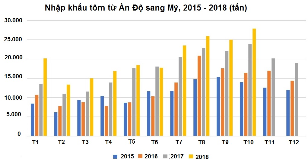 Đây là tháng thứ tư liên tiếp kể từ tháng 6, Ấn Độ tăng XK tôm sang Mỹ. Mười tháng đầu năm 2018, Ấn Độ XK sang Mỹ 203.699 tấn tôm, tăng 17% so với cùng kỳ năm 2017.