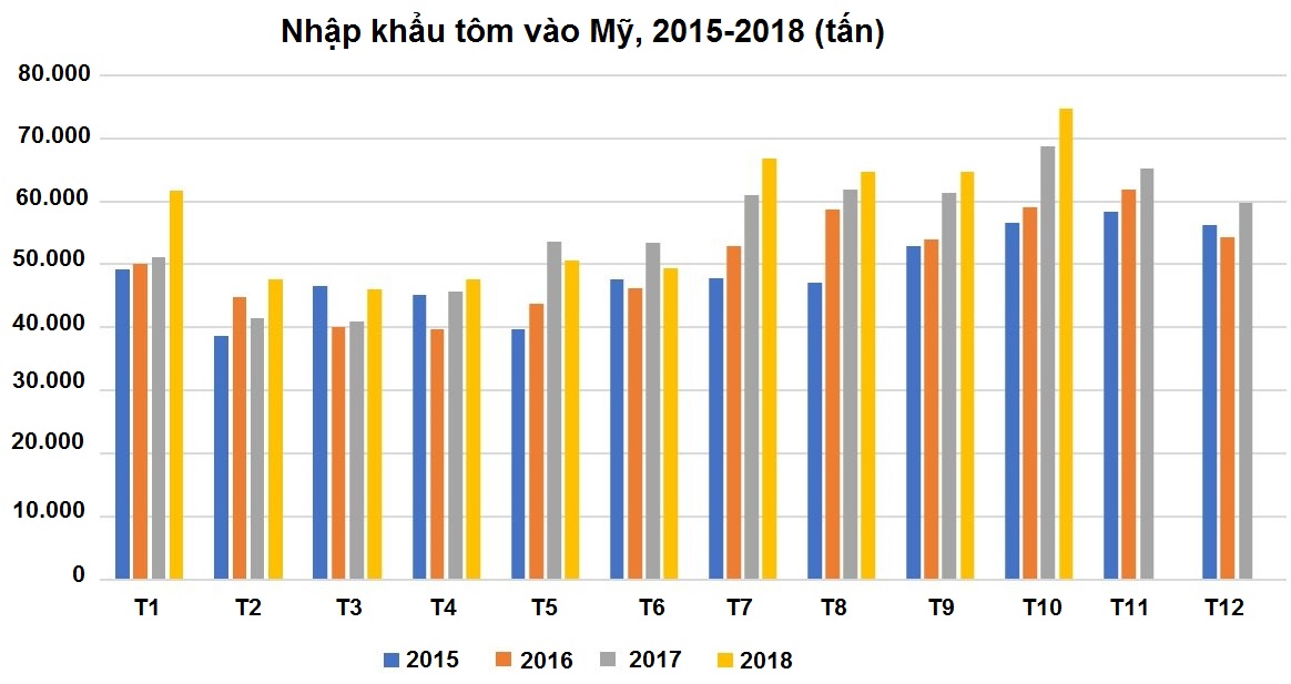 Năm 2017, trung bình một người Mỹ ăn 4,4 pao tôm, tăng 0,3 pao so với năm 2016 (4,1 pao). Đây là một dấu hiệu tốt cho thương mại tôm tại Mỹ. Mỹ cũng có xu hướng NK nhiều tôm hơn trong năm 2018 so với năm 2017. Mười tháng đầu năm 2018, Mỹ NK 565.929 tấn tôm, trị giá 5,1 tỷ USD, tăng 5% về khối lượng và giảm 4% về giá trị so với cùng kỳ năm 2017.