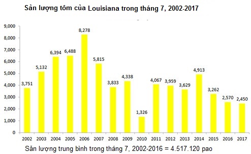 Sản lượng tôm tại Louisiana vào tháng 7/2017 gần bằng một nửa so với mức trung bình của 15 năm trước đó là 4,5 triệu pao.