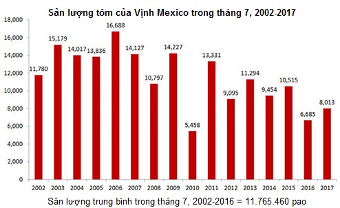 Trong 7 tháng đầu năm 2017, tổng sản lượng tôm của Vịnh Mexico đạt 49,2 triệu pao, tăng đáng kể so với cùng kỳ năm 2014 (40,5 triệu pao), năm 2015 (40,4 triệu pao ), và năm 2016 (41,9 triệu pao), nhưng giảm 10,1% so với mức trung bình là 54,7 triệu pao trong 15 năm trước đó.