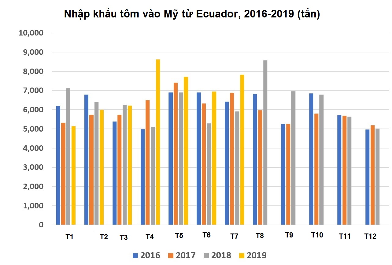 Ecuador – nguồn cung tôm lớn thứ 3 cho Mỹ, tiếp tục tăng XK tôm sang Mỹ. Tháng 7/2019, nước này XK sang Mỹ 7.818 tấn tôm, trị giá 54,8 triệu USD, tăng 33% về khối lượng và 40% về giá trị so với tháng 7/2018.