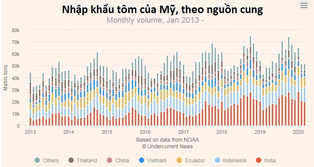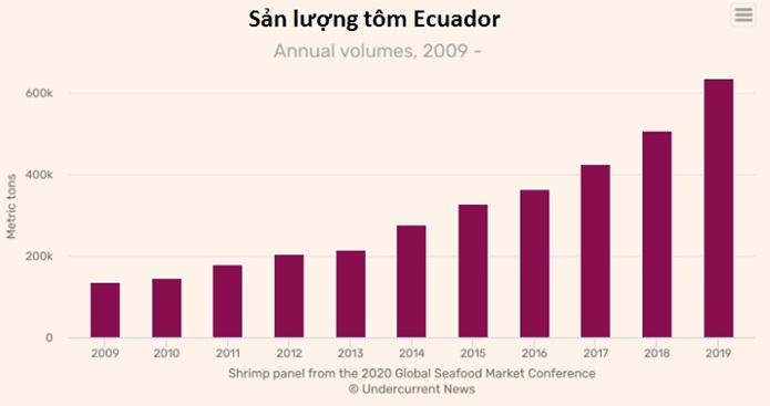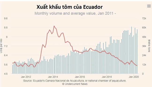 Sản lượng tôm của Ecuador vẫn tăng trưởng hai con số. XK tôm của Ecuador trong tháng 3 và 4 năm nay tương đương so với cùng kỳ năm ngoái nhưng lại giảm so với 2 tháng đầu năm nay do ảnh hưởng của dịch Covid-19.
