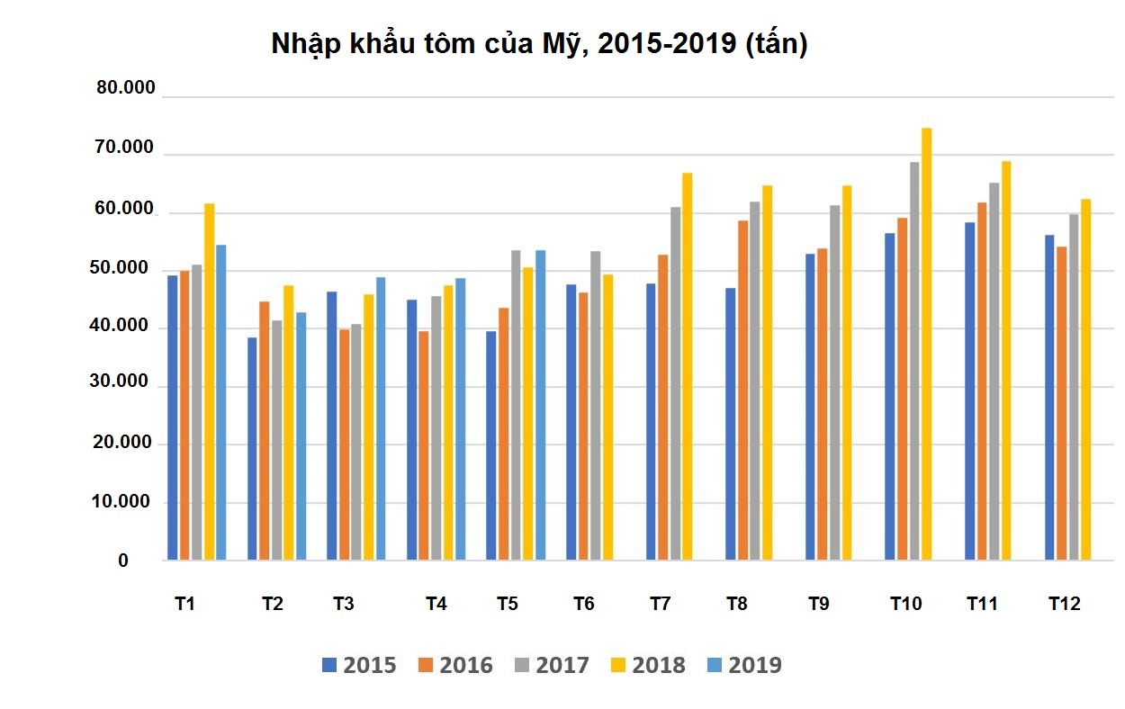 Giá trị NK tôm của Mỹ tháng 5/2019 đạt 443,7 triệu USD, giá NK trung bình đạt 8,26 USD/kg, tương đương với tháng 4/2019. Mỹ NK 50.510 tấn tôm trong tháng 5/2018, trị giá 453,2 triệu USD, với giá NK trung bình đạt 8,95 USD/kg.