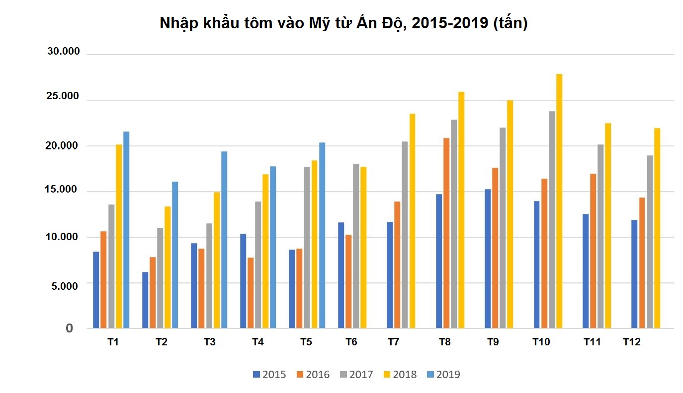 Ấn Độ - nguồn cung tôm lớn nhất cho Mỹ, XK 20.391 tấn tôm sang Mỹ trong tháng 5, trị giá 164 triệu USD, tăng 11% về khối lượng nhưng giảm 2% về giá trị so với cùng kỳ năm ngoái. 5 tháng đầu năm nay, Ấn Độ XK sang Mỹ 95.135 tấn tôm, tăng 14% so với năm tháng đầu năm 2018, giá trị XK đạt 788,1 triệu USD, giảm 2%.