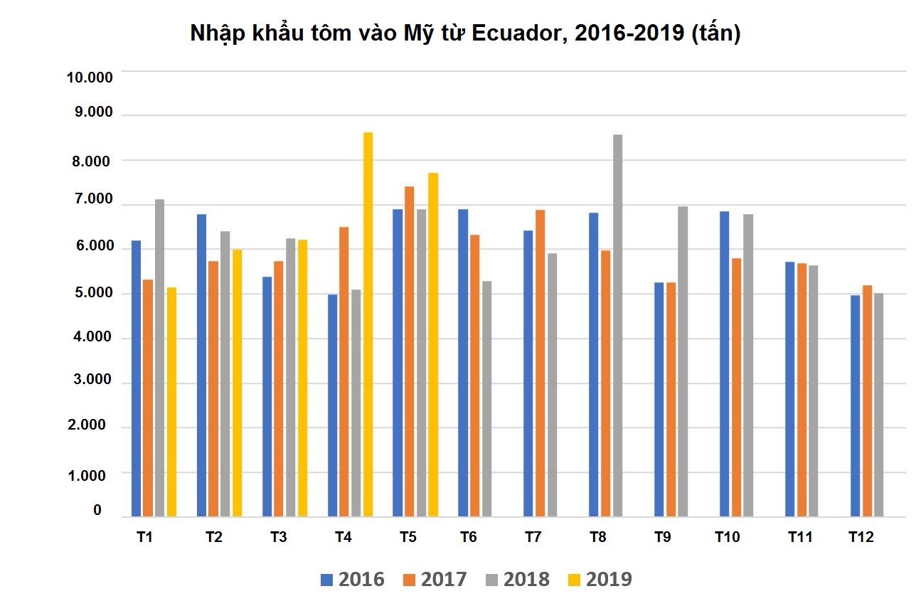 Tháng 5/2019, Ecuador XK 7.718 tấn tôm sang Mỹ, trị giá 49,3 triệu USD, tăng 12% về khối lượng và 4% về giá trị so với cùng kỳ năm 2018. 5 tháng đầu năm nay, khối lượng tôm Ecuador XK sang Mỹ tăng 6% so với cùng kỳ năm ngoái.