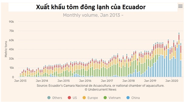 Ecuador cũng XK 11.285 tấn tôm sang EU trong tháng 6, tăng 53% so với tháng 5. XK sang Trung Quốc giảm gần 50% trong tháng 6 với 27.081 tấn.