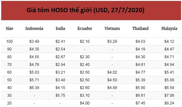 Tính tới 27/7, giá tại đầm tôm HOSO của Ecuador đạt 3,10 USD/kg đối với cỡ 20/30; 2,60 USD/kg đối với cỡ 30/40; 2,50 USD/kg với cỡ 40/50; 2,50 USD/kg với cỡ 50/60; 2,30 USD/kg với cỡ 60/70 và 70/80; 2,10 USD đối với cỡ 80/100; và 2 USD với cỡ 100/120.