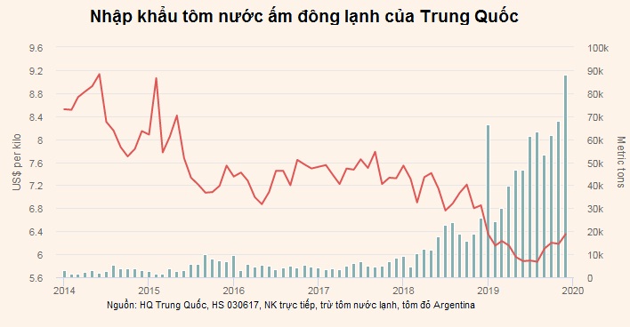Năm 2019, NK tôm nước ấm trực tiếp của Trung Quốc (chủ yếu là tôm nuôi) tăng mạnh nhất, tăng 237% đạt 649.000 tấn.