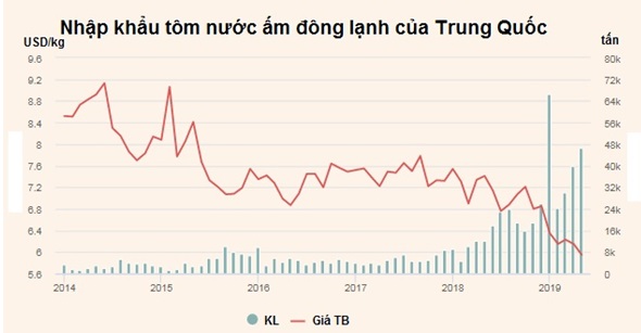Giá NK tôm trung bình vào Trung Quốc trong tháng 5/2019 đạt 5,95 USD/kg, giảm so với 6,15 USD/kg trong tháng 4.