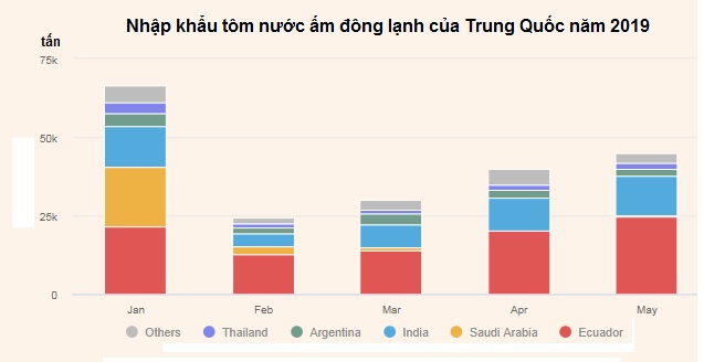 Nguồn cung tôm lớn nhất cho Trung Quốc trong tháng 5 là Ecuador. Ecuador cung cấp 24.664 tấn tôm nước ấm đông lạnh cho Trung Quốc, tăng 21% so với tháng 4/2019.