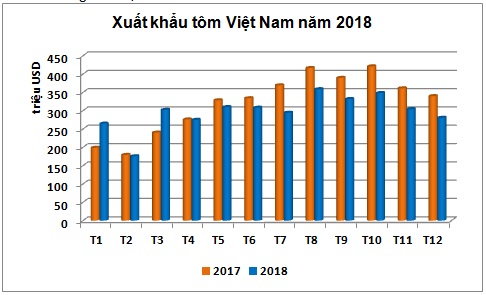 (vasep.com.vn) Kết thúc năm 2018, XK tôm Việt Nam không khả quan như mong đợi, giảm 7,8% so với năm 2017 đạt 3,55 tỷ USD và giảm... so với mục tiêu đã đề ra. Trong năm 2018, XK tôm chỉ tăng trong 2 tháng 1 và 3, XK trong các tháng còn lại đều giảm.