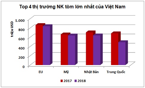 Năm 2018, XK tôm Việt Nam sang 4 thị trường chính đều giảm trong đó giá trị XK sang Trung Quốc giảm mạnh nhất 28%, Nhật Bản giảm 9,2%, XK sang EU và Mỹ giảm lần lượt 2,8% và 3,3%. XK sang Hàn Quốc và Canada tăng nhẹ, lần lượt 1% và 3,5% so với năm 2017.