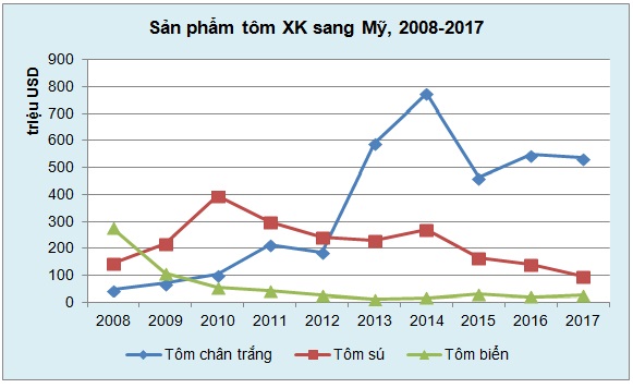 Kể từ 2013 đến 2017, tỷ trọng tôm chân trắng XK sang Mỹ luôn cao hơn tôm sú. Trong giai đoạn này, giá trị XK tôm chân trắng luôn gấp gần 3 lần so với tôm sú. Trong 10 năm (2008-2017), XK tôm chân trắng đạt mức cao kỷ lục vào năm 2014 với 775,7 triệu USD; chiếm gần 73% tổng giá trị XK tôm của Việt Nam sang Mỹ.