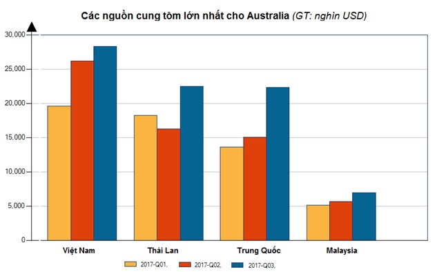 Chín tháng đầu năm 2017, giá trị NK tôm của Australia đạt 207,9 triệu USD; tăng 7,9% so với cùng kỳ năm 2016. Việt Nam là nguồn cung tôm lớn nhất cho Australia, chiếm 35,6% tổng giá trị NK tôm của Australia. Thái Lan là nguồn cung lớn thứ hai, chiếm 27,4%. Tiếp đó là Trung Quốc chiếm 24,5%. Trong 3 nguồn cung tôm lớn nhất cho Australia, NK từ Việt Nam và Thái Lan tăng lần lượt 15,4% và 28,4% trong khi Trung Quốc giảm 12,6%.